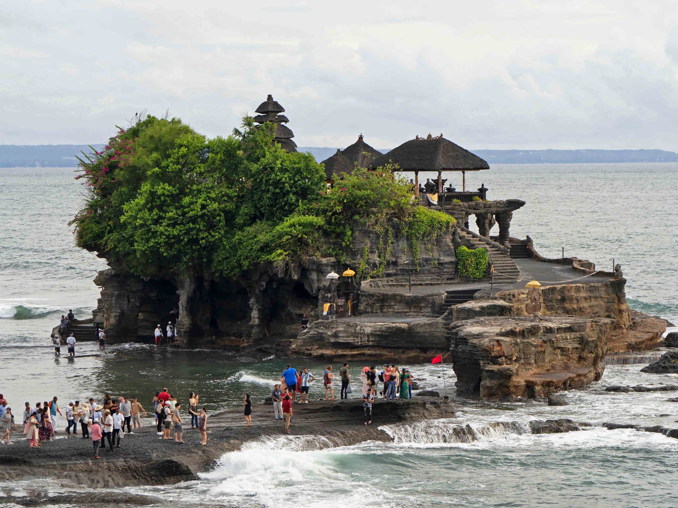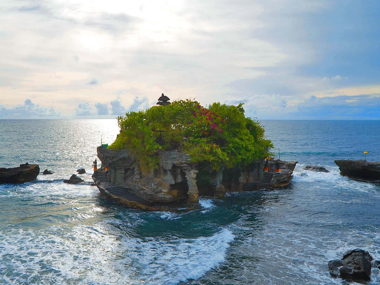 - Tanah Lot Temple Tanah Lot is a must-visit spot when on holiday in Bali! This iconic landmark, with a temple perched on a rock, looks stunning during sunset. It’s perfect for those looking to take aesthetic photos or enjoy the unique atmosphere of Bali. You can’t say you’ve been to Bali without stopping by here!