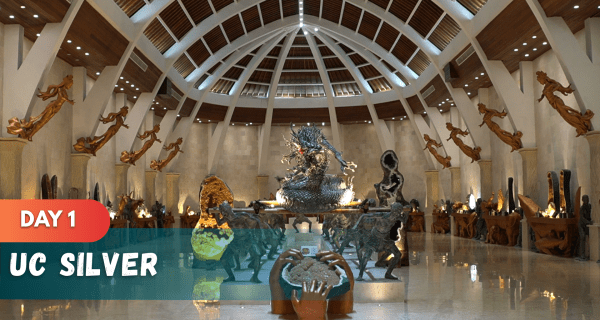 - 09:00 – 10:00 UC Silver – free visit - Galeri silver : UC Silver itu salah satu tempat keren yang wajib masuk itinerary tour kamu di Bali. Tempat ini adalah toko perhiasan perak terkenal di Bali, dengan desain unik dan detail yang super keren. Selain belanja perhiasan kece, kamu juga bisa lihat langsung proses pembuatannya—dari bongkahan perak sampai jadi cincin atau gelang cantik. Tempatnya instagramable banget, jadi siapin kamera buat foto-foto! Kalau lagi cari oleh-oleh elegan khas Bali, UC Silver bisa jadi pilihan yang pas.