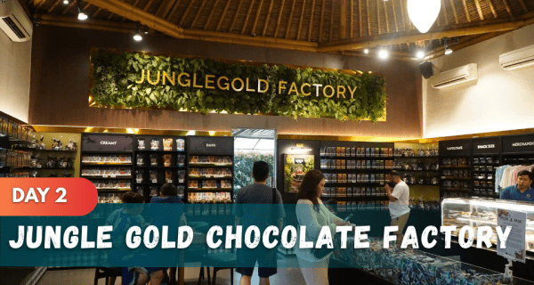 - Mengunjungi JUNGLE GOLD CHOCOLATE FACTORY (entrance fee only), menikmati pengalaman seru melihat proses pembuatan cokelat alami khas Bali, aroma kakao, suasana hijau, dan spot foto unik di setiap sudutnya.